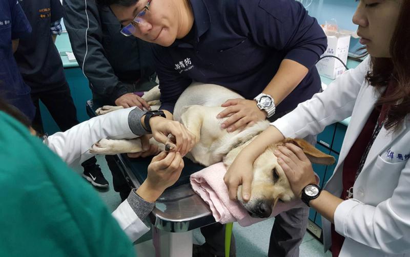 圖:搜救犬「鐵雄」在救援時受傷,中興大學獸醫教學醫院緊急為牠診治\中央社