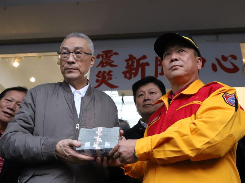 圖:國民黨主席吳敦義11日向花蓮災民捐出新台幣100萬元現金 中央社