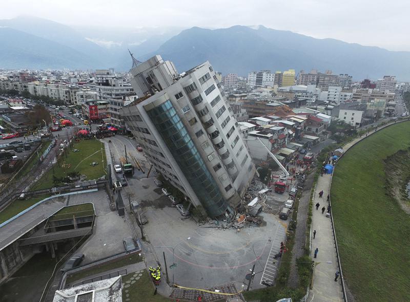 圖:花蓮地震造成多幢建築物倒塌。台當局將在全台啟動高樓耐震評估,加強樓宇安全 美聯社
