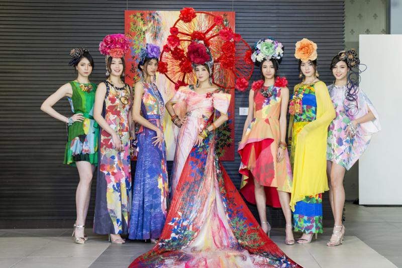 版畫大師鍾有輝的創作展「萬葉集」在台北孫中山紀念館展出,鍾有輝特別與服裝設計師林國基跨界合作,將作品應用在服裝上,並請來名模走秀,進行一場美的饗宴 中央社