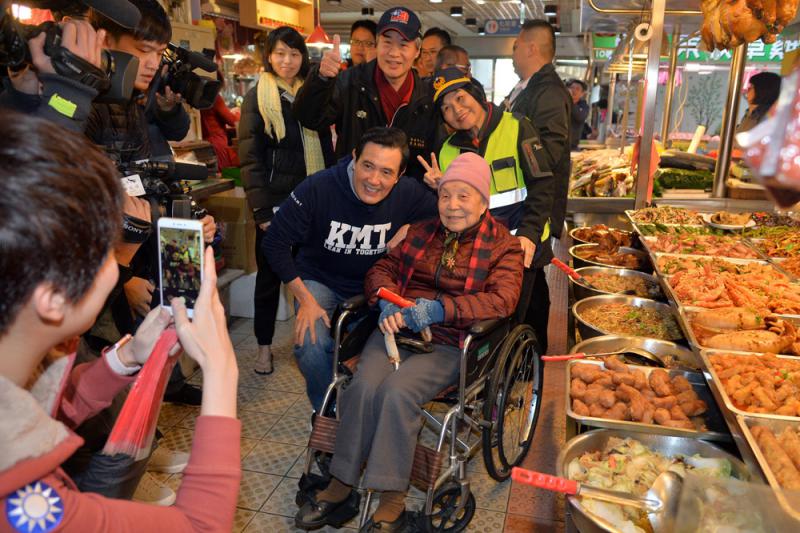 台灣當局前領導人馬英九(前左)14日到家附近的興隆市場採買年菜,也沿途發放春聯,受到街坊們的熱情歡迎,紛紛要求合影。 中央社