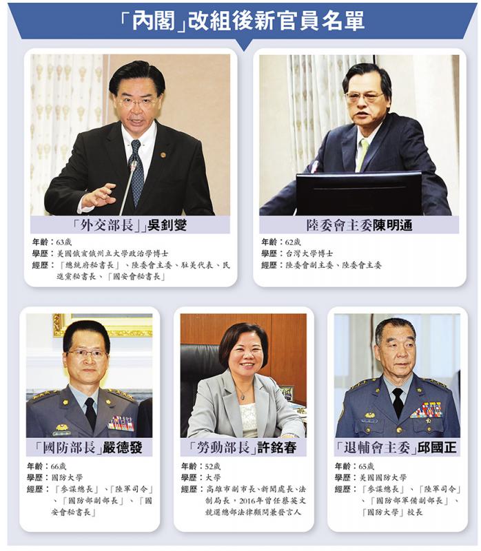 台「行政院」發言人徐國勇23日宣布「內閣」改組名單,主要集中在兩岸、「外交」、「國安」等部門。外界負評如潮,批評變來變去都是一批「老面孔」、「沒新意」。尤其對於曾為陳水扁撰寫所謂「第二共和憲法」的陳明通再度出掌陸委會,台灣學者憂慮兩岸關係前景不樂觀。國民黨發言人洪孟楷則批評,與民生經濟相關的部會首長卻不動如山,幾位有爭議的首長也穩如泰山,認為蔡當局與民意脫節嚴重,「內閣」改組未迎合人民期待。/大公報記者 蘇榕蓉