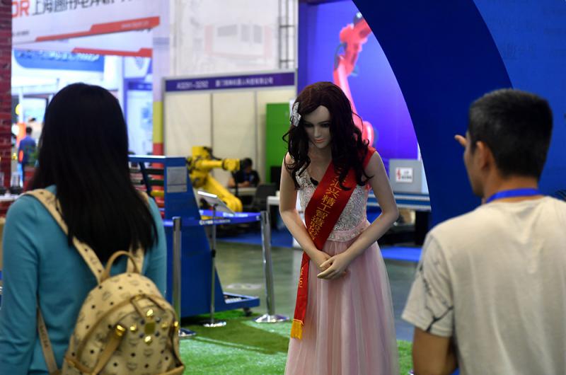 圖:在兩岸機械電子商品交易會,機器人向參觀者鞠躬並問好 中新社