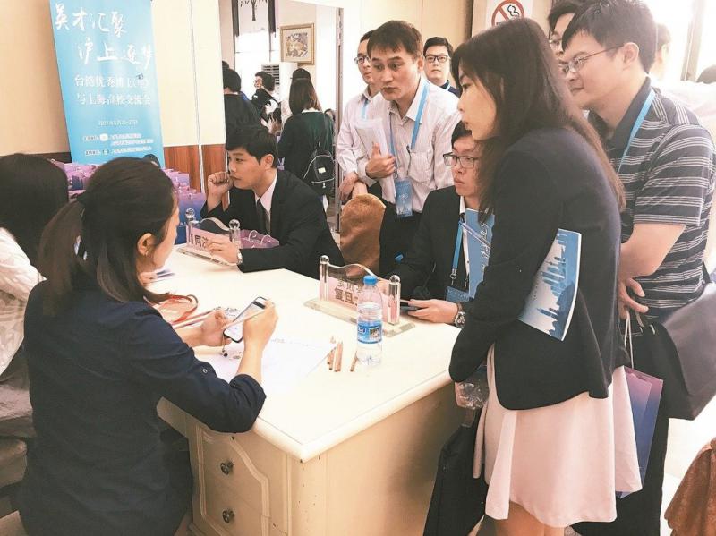 上海對外經貿大學的攤位一個下午收到16份台灣博士的簡歷。該校工作人員介紹,學校重視人事人才工作,結合學校自身「外貿」特色,希望從台灣優秀人才中發掘契合學校發展需要的人才。