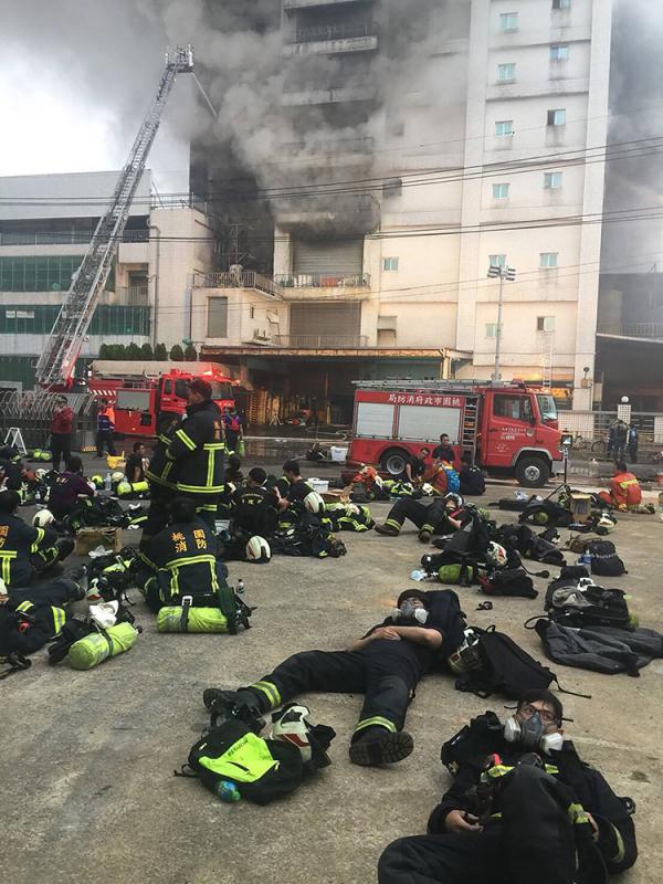 圖:桃園市敬鵬工廠大火燒了18小時,不少消防員累癱 中央社