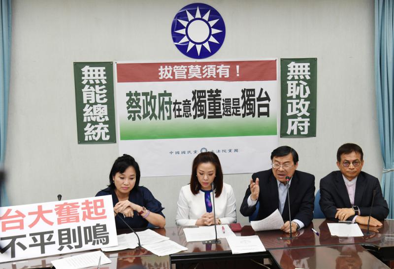 圖:中國國民黨立委30日召開記者會,指台灣大學校長當選人管中閔聘任案遭「教育部」駁回,「拔管莫須有」,質疑政府在意的是「獨董」還是「獨台」\中央社
