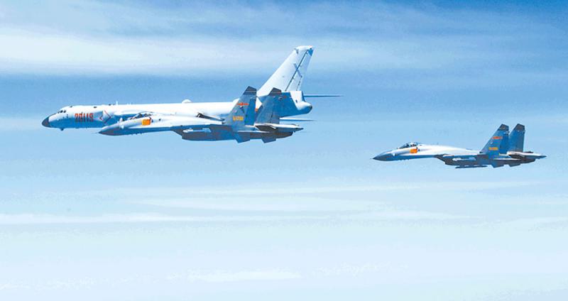 4月26日上午,空軍多型殲擊機、多型預警機、多型偵察機和轟-6K戰機成體系開展了海上方向實戰化軍事訓練。轟-6K等多型戰機編隊飛越宮古海峽和巴士海峽,實施了「繞島巡航」訓練課題。