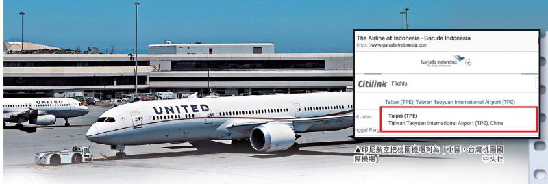 據中央社報道,印尼航空已把台灣桃園機場列為「中國,台灣桃園國際機場(台北)」,將桃園機場與廣州等城市的機場歸類在中國之下。