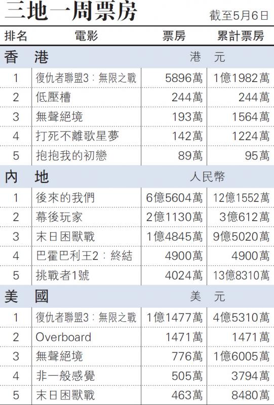 內地票房方面,《後來的我們》連續第二周登上票房榜第一位,票房累積超過十二億人民幣,令劉若英登上賣座導演行列,此片亦成為今年票房榜第六位;《幕後玩家》躍升一位,排第二位;《末日困獸戰》(Rampage)(內地片名《狂暴巨獸》)跌了一位,排第三位;新上畫的印度古裝片《巴霍巴利王2:終結》(Baahubali 2: The Conclusion)排第四位;《挑戰者1號》(Ready Player One)(內地片名《頭號玩家》)維持第五位。此外,內地導演劉一君的《香港大營救》新上畫,收五百零七萬人民幣,排第十一位;紀念馬克思誕生二百周年的法國電影《青年馬克思》(The Young Karl Marx)新上畫,收一百零四萬人民幣。