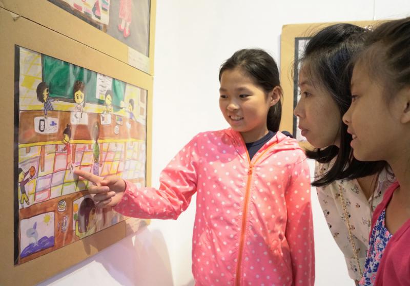圖:國台辦指出,兩岸同胞自然是一家親。圖為日前台北兩岸少兒美術大展,小朋友介紹作品\新華社