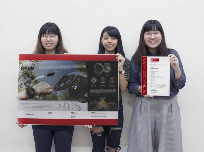 台北科技大學創新設計所4名學生結合無人機與智慧穿戴裝置,共同設計出「表形無人機」AIRescuer,拿下2018年德國iF設計獎的新秀獎首獎「年度最佳設計」。該設備可戴在手腕上,並配可拆小型無人機,具求救功能。 (中央社)