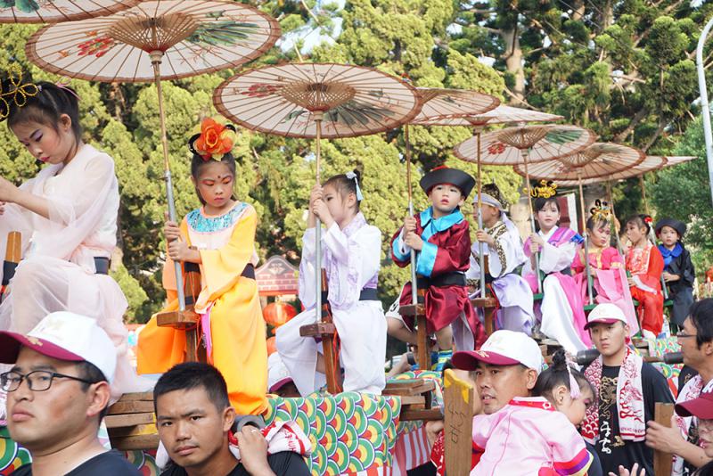 蜈蚣座是金門地區傳統藝陣之一,陣頭出巡有滌盪邪穢、除惡辟邪意義。2018金門迎城隍─蜈蚣座親子嘉年華活動19日在金城鎮登場,62節蜈蚣座綿延110公尺,十分壯觀。小朋友個個打扮得嬌艷可愛,整個隊伍華麗熱鬧,引來不少民眾圍觀。 (中央社)
