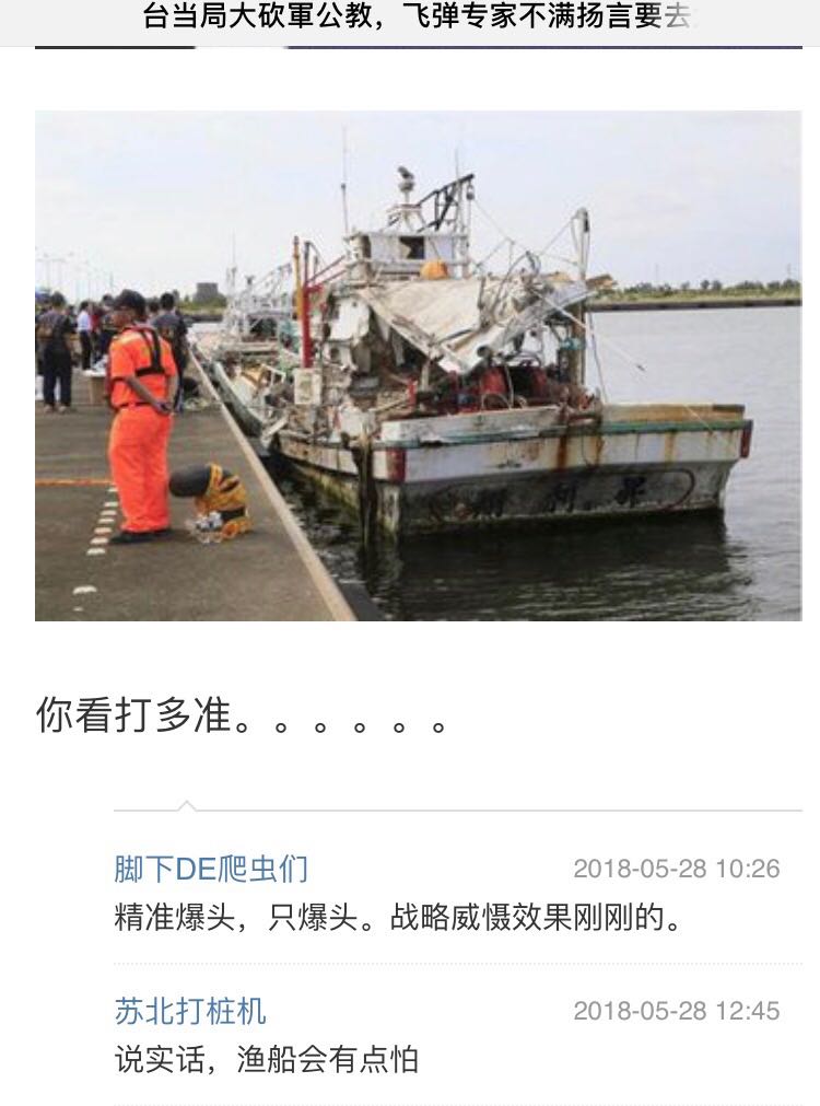 在大陸知名論壇《天涯社區》上出現一篇討論,台灣前「中科院」主任工程師陳博士揚言要去大陸講學談導彈。大陸網友不僅不買賬,甚至拿出之前台灣「雄三飛彈誤射漁船事件」出來狂酸,甚至還有網友貼出當年漁船被打穿的照片並回復「你看打多準」、「咱們漁船傷不起阿,漁民沒有得罪你吧」。