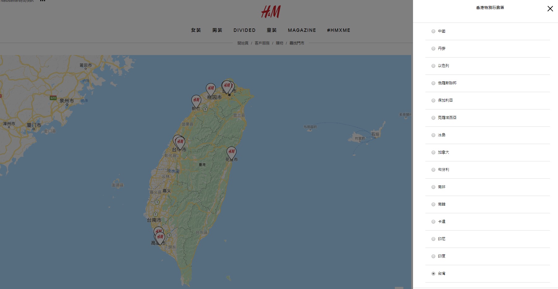 H&M繁體版網站把台灣與中國並列「國家」欄位(網站截圖)