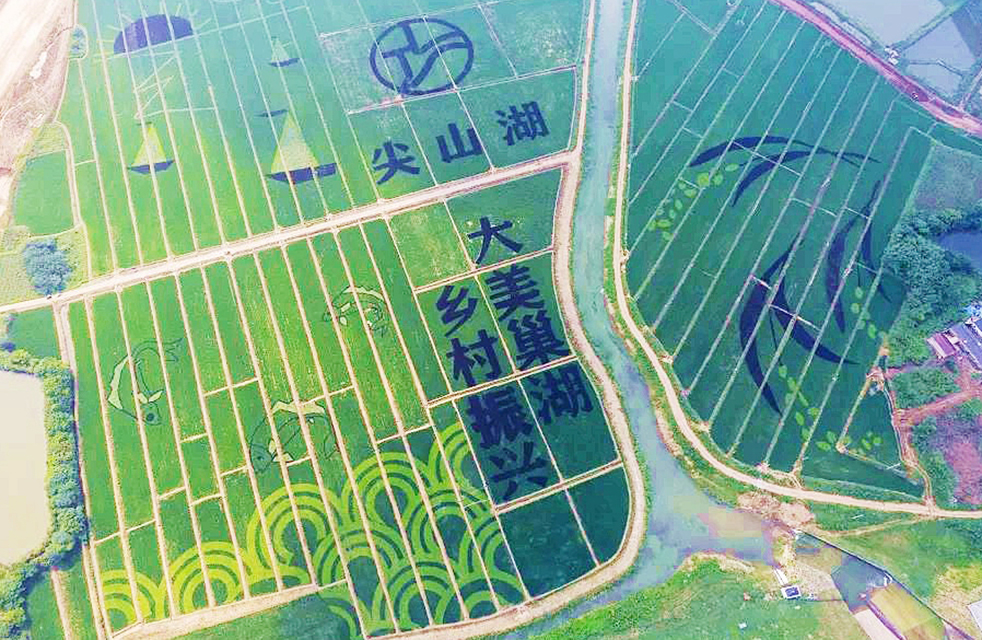 在安徽省巢湖之畔,有一幅美麗的稻田畫,五彩水稻按圖形排列播種,在田野間繪成魚、水稻、湖面、浪花等巢湖元素濃郁的爛漫畫作,而一旁「鄉村振興 大美巢湖」的字樣,將這片好玩好景的尖山湖逸趣園點綴成合肥周邊又一「網紅打卡點」。