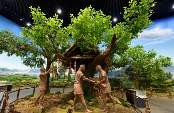 「遠古時期的巢湖」展廳由渾然天成、蒙昧初開兩個單元組成。其中展現了金釘子、巢湖魚龍動物群、魚龍化石、巢湖盆地地形等,「銀山智人遺址」場景再現了銀山及其周圍地貌,銀山智人切割獸皮、打制石器等生活生產畫面栩栩如生;「有巢氏」利用仿製的大樹和木屋複原了有巢氏構木為巢的場景。