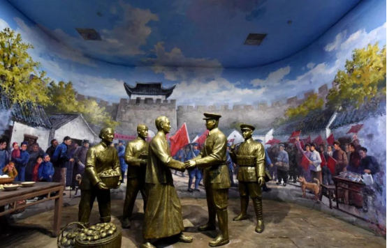 隨後是「巢湖革命歷程」展廳、「巢湖非遺」展廳和「巢湖名人」展廳等。其中,「巢湖革命歷程」展廳由中國共產黨的創建和大革命時期、土地革命時期、抗日戰爭時期、解放戰爭時期等單元組成。從1919年到1949年30年間,巢湖人民在中國共產黨的領導下,為求取民族解放與民族復興作出不懈的努力,付出的巨大犧牲。其中有巢縣人民群眾歡送北伐軍場面;有再現蔣家河口伏擊戰,新四軍打響「東進抗日第一槍」的戰鬥場景;也有再現「渡江第一船」渡江場面。