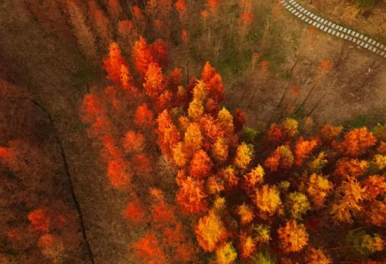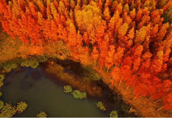 數以百計的池杉正呈紅黃綠三色交相呼應着,美不勝收