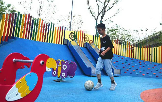 小朋友在遊園內踢球。蜀山區委宣傳部供圖。