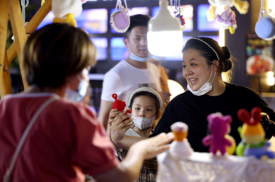7月21日晚,在由老廠房改造的安徽省合肥市長江180藝術街區,市民在夜間市集休閑購物