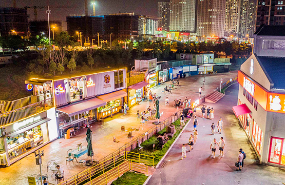 7月21日晚,在由老廠房改造的安徽省合肥市長江180藝術街區,市民在「集裝箱市集」休閒遊玩