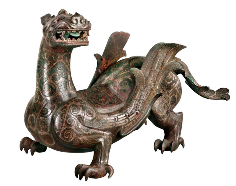 這件神獸長四十厘米、高二十四厘米,酷似中國神話傳說《山海經》中風神「飛廉」的形象。它前胸寬闊低垂,兩翼直指長空,四肢弓曲、利爪怒張、圓頸挺立,昂首向一側,彷彿在大聲咆哮。神獸的口、眼、耳、鼻、羽毛等處均錯有銀線紋,身上的錯銀卷雲紋千變萬化,其背部還有蜷曲於雲中的錯銀鳥紋,精美的錯銀紋飾與古樸的青銅交相輝映,充滿了神秘氣息。