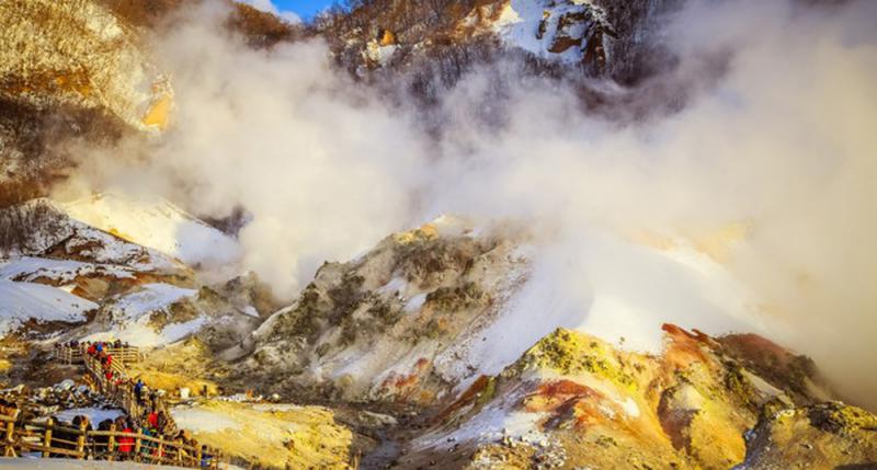 火山與溫泉隨影隨行,很像一對孿生兄弟。日本北海道的登別地區,活火山噴發白色塵埃,溫泉冒出白色蒸汽,白色的塵埃和白色的蒸汽在空中飄飄渺渺,搖擺升騰,好像找不到去處似的。登別溫泉號稱「日本第一湯」,是日本最具代表性的溫泉區之一。「登別」一詞來自當地少數民族阿伊努的語言,意為「白色的河」或「渾濁的白色河流」。