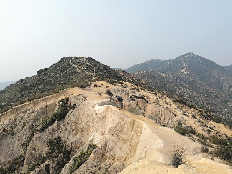 登上大青山後,大部分行山者會取原路返回。但要挑戰杯靈雙渡,這才是熱身而已。「韓陵片石亭」的右手是一堆巨石,石下有一條小徑,由浮沙大路下降山坳,就是良景坳。沿途風貌,與香港其他地區的林木茂盛截然不同。這裏的山頭只長草,沒有任何一棵樹,名副其實的黃土低坡。從地質上看,香港這片土地的年代並不算久遠,山岩分化得不夠,表面上是碎石加浮沙,未變成土壤,缺少養分,因此只能長草,未足以長樹,亦因此群山逶迤,無掩無遮,一覽無遺。大青山之得名,想必是一片「青草山」之意。
