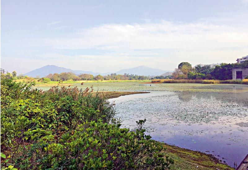 沿大草地左側的短斜坡,我們踏上圍繞着整個南生圍的車路──南生圍路,這一車道是踩單車和駕駛者共用的空間,兩旁的小徑也沒有單車與行人之分,結伴騎單車、時而駐足欣賞風景,步行或跑步強身健體,偶有汽車經過,大家互相禮讓。沿途可遠眺深圳的高樓大廈和香港新界的綿延山景,近處是拉姆薩爾濕地。它是由錦田河、山貝河和其他河道的河口在后海灣沉積而形成的廣闊泥灘,不時有白鷺在踱步或覓食。一到冬天,成千上萬的候鳥會在此停留。