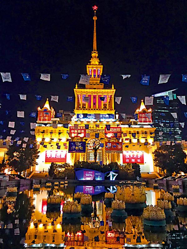 離開展覽中心時,我拍攝下夜空中它璀璨奪目的樣子。俄羅斯古典主義的建築風格,直插雲霄的塔尖上紅色的五角星閃閃爍爍,金碧輝煌的主樓在池塘中映出了倒影,恍惚覺得自己像步入了迪士尼樂園。我從來沒有見過如此摩登而耀眼的展覽中心,這是逛書展夜場帶來的驚喜。