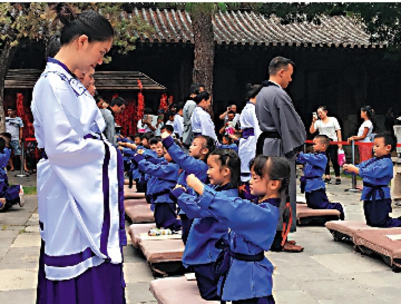 在文廟,孩子們給父母行三叩九拜之禮\大公報記者譚旻煦攝