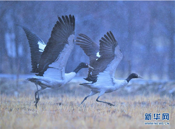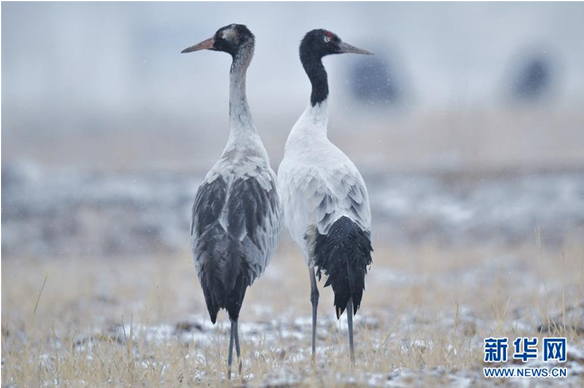 12月18日在拉薩市林周縣境內拍攝的黑頸鶴。拉薩市林周縣是著名的黑頸鶴越冬地,每年10月中旬開始,有大批黑頸鶴遷徙到此。據介紹,在林周縣越冬的黑頸鶴數量穩定在1700只左右,最高可達2000只左右。12月18日至19日,西藏大部分地區普遍降雪,雪中的黑頸鶴顯得格外美麗。(新華社記者普布扎西攝