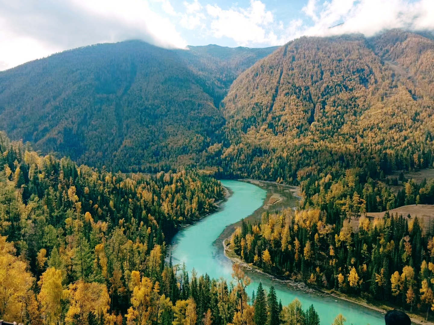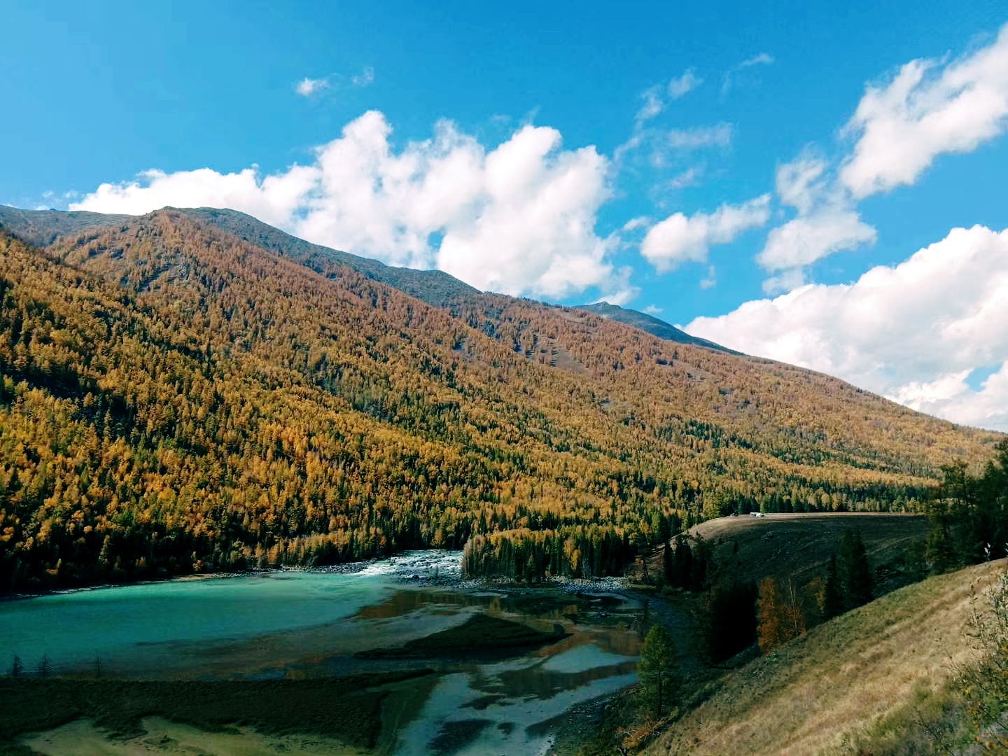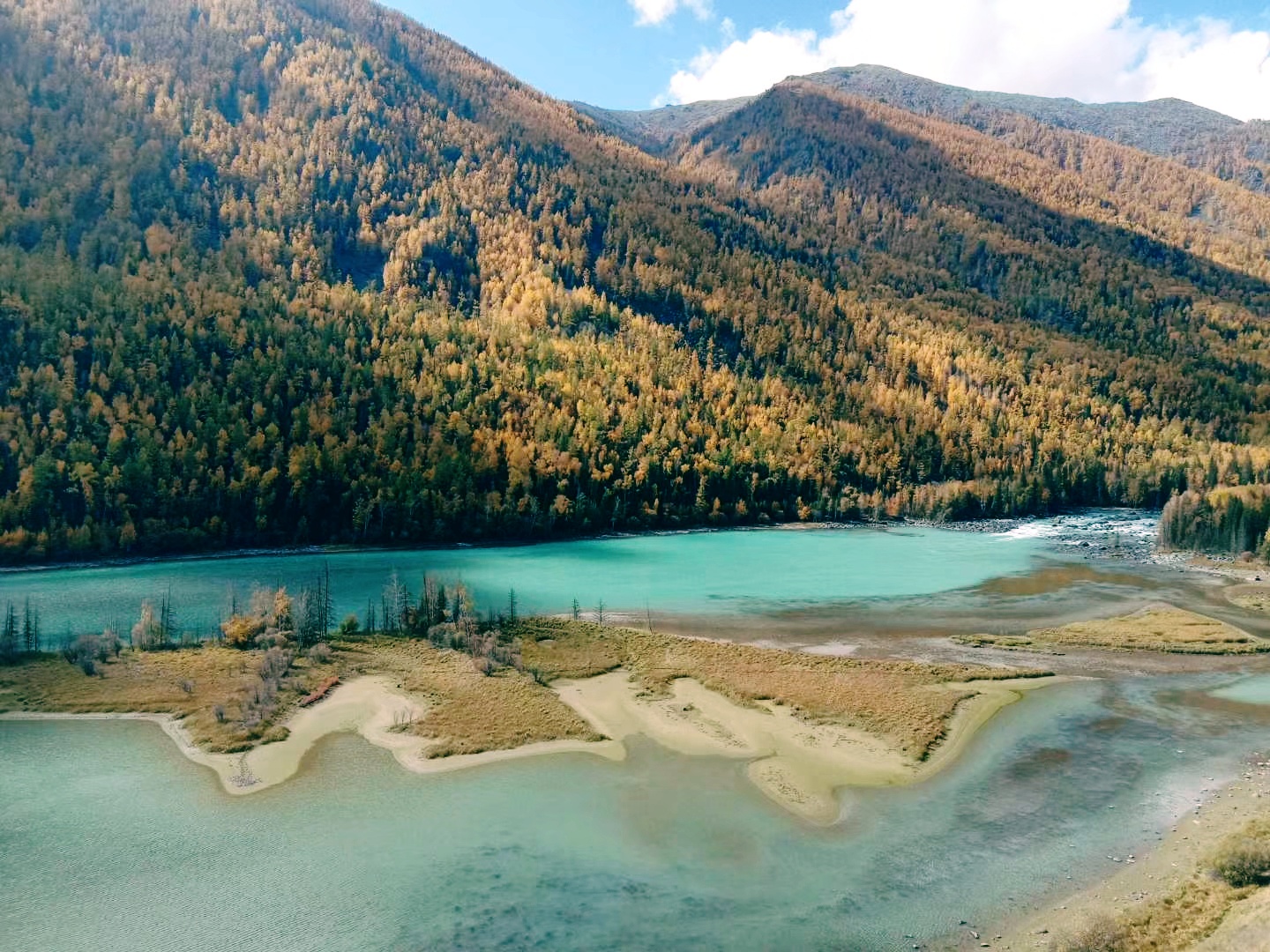 喀納斯的紅葉,是生命在晚秋的吟誦。雄偉的阿爾泰山守衛着深秋的白湖,山頂上的白雪銀光閃閃,像是天神在給天地加冕。雪線下,山林黃綠相間,是山水間靚麗的風景線。湖山相映,妙趣天成。