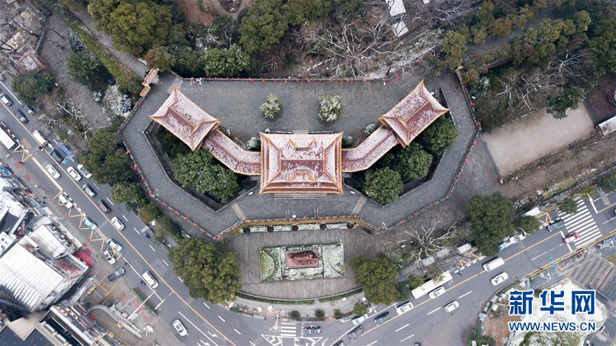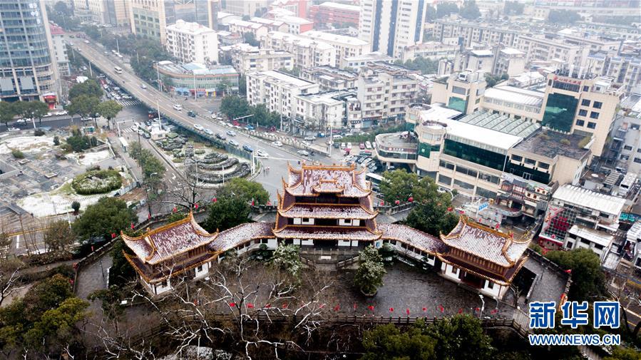1月16日無人機拍攝的長沙天心閣。當日,湖南長沙市迎來一場降雪,古城樓天心閣在白雪的覆蓋下顯得靜謐雅致。
