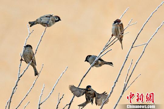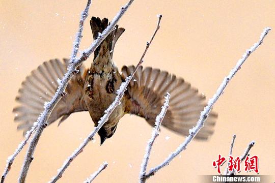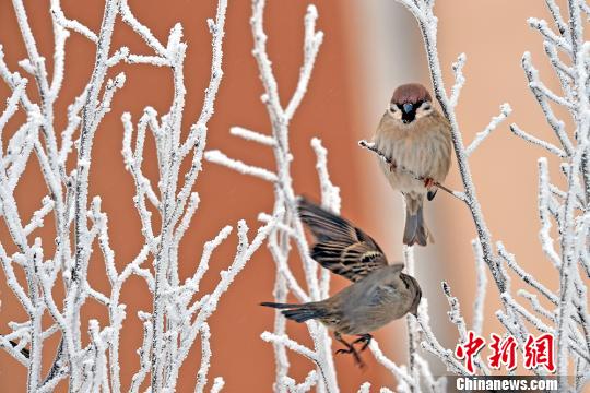 麻雀在霧凇枝頭時而飛,時而停留。 閔勇 攝
