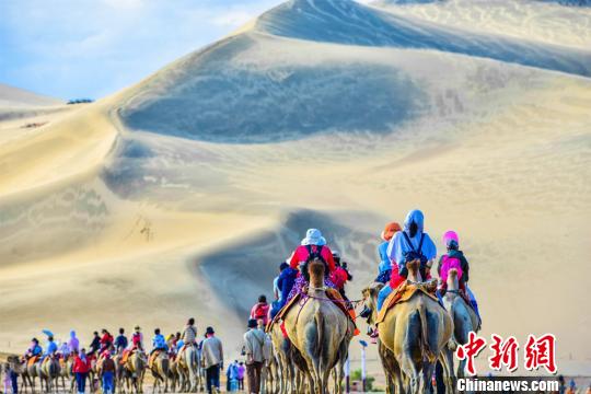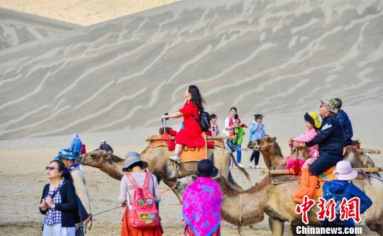 圖為中外遊客騎駱駝暢遊鳴沙山,觀賞大漠風光,體驗絲路風情。 王斌銀 攝