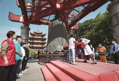 4月29日,抗疫一線代表在武漢黃鶴樓景區撞鍾儀式上合影。當日,武漢黃鶴樓景區重新開放。目前,景區不提供窗口售票,遊客通過網絡實名預約購票。黃鶴樓主樓部分開放,每半小時允許300名遊客進入。