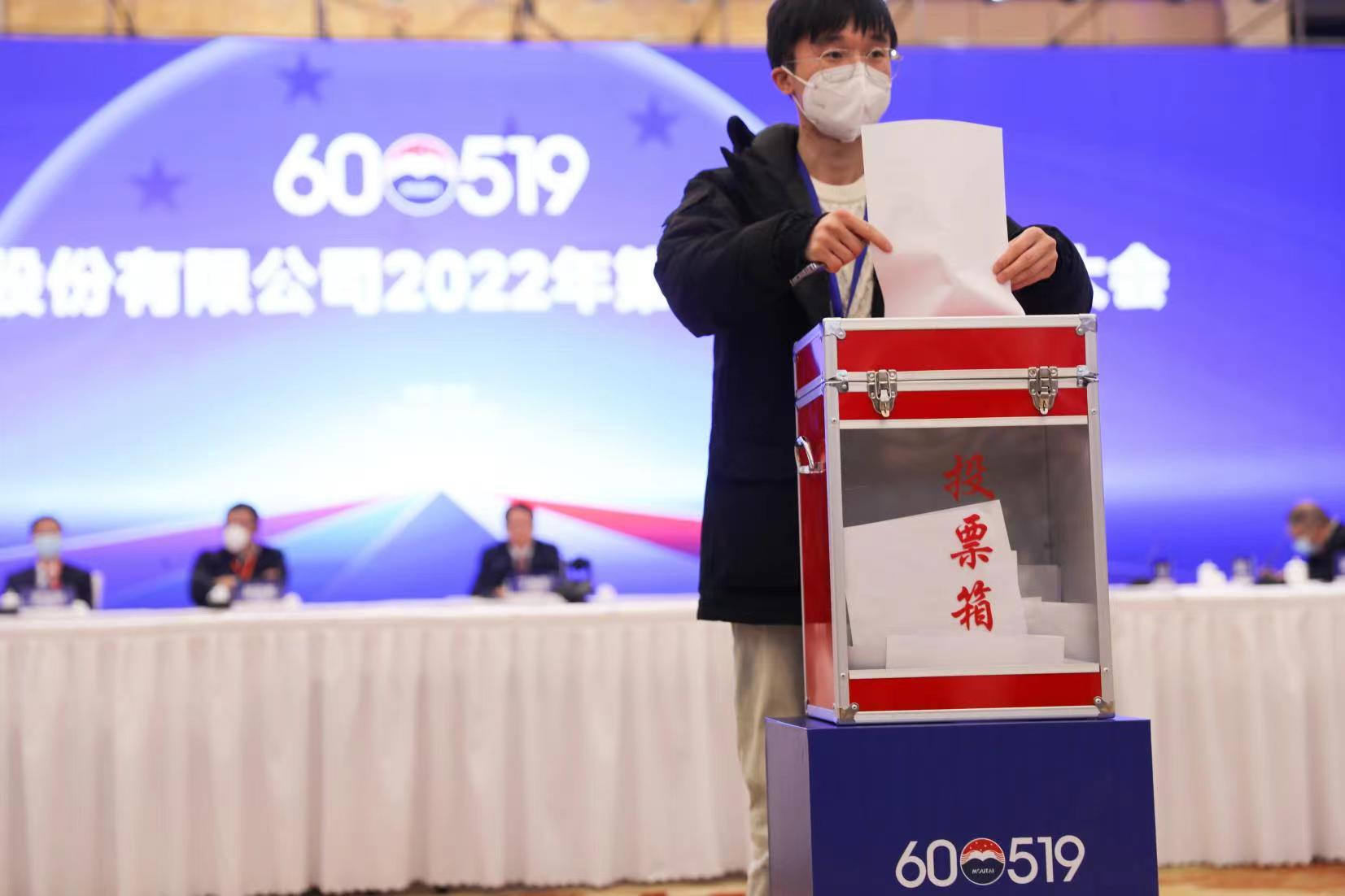 當天下午,貴州茅台2022年第一次臨時股東大會在茅台國際大酒店舉行,90餘名股東、分析師出席。大會採取現場投票和網絡投票相結合的方式,高票審議通過了《關於修訂<公司章程>的議案》《關於修訂<公司董事會議事規則>的議案》《回報股東特別分紅方案》。