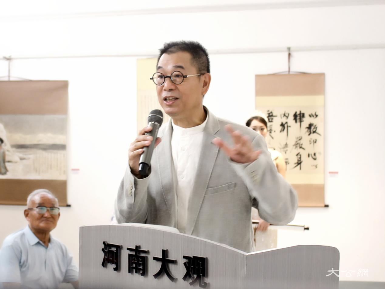 開幕式由河南大觀美術館館長楊永剛館長主持,他詳細介紹了黃錦江先生,是藝術領域令人敬重的 「多面手」 。他以演員身份,塑造經典反派人物,在銀幕上留下深刻印記;更以書畫家、藝術創作者的姿態,在書畫、舞美設計、服裝設計等領域深耕,實現 「藝術相通」 的精彩跨越。他的美術作品在全球多地博物館、美術館、畫廊所收藏,手書巨幅《滿江紅》作為香港 「亞洲藝術節開幕」 舞劇《岳飛》的大幕等許多藝術成就。