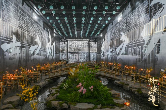 從形式到內容、思想,記者從《竹海幻境》中處處品味着中式美學,特別是劇目所演繹的楚風美學的精髓更是讓記者受益無窮。不僅有贈香草、成人禮、曲水流觴宴等傳統儀式,還配之以東方既白、滄浪綠、桃夭粉等傳統色繫,從燈具餐具的樣式設計到宴會食物的楚辭命名,無不浸潤着中華優秀傳統文化的元素。
