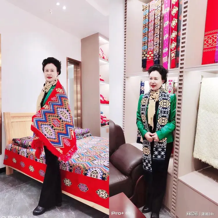 我被她的作品深深吸引,興奮地試穿了織錦旗袍,披上了織錦圍巾,甚至坐在織錦裝飾的床上,深入車間觀摩織造過程,內心充滿了對這份藝術的熱愛與敬仰。我願為這些精美的作品公益發聲,因為我也是土家族的一員,深知這份文化遺產的珍貴。