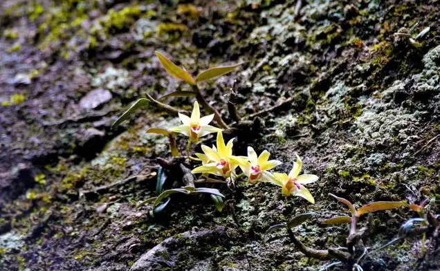 高聳獨立的百米崖壁上,點點淡黃色在半空中迎風飄搖,崖壁之上偶有幾位採摘工人靠着安全繩索的保護上下攀援,摘取成熟的鐵皮石斛。每逢鐵皮石斛成熟季,遊客便會在崀山鎮的仿野生鐵皮石斛基地瞥見這幅神奇的場景。