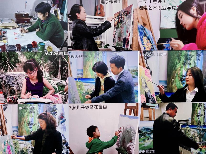 在美術館C4展廳,陳列展出了戴平均三位親人的73件作品。這是三代人同框同展,作品各具鮮明個性和家的色彩。展覽中,我們看到的情景尤為令人羡慕:母親在作畫、哥哥在創作、嫂子在畫畫、哥哥的女兒在畫畫、他在教女兒畫畫、妻子枚子在畫畫、七歲的兒子認真在畫畫,一家人在畫室裏欣賞畫……這些向上向善向美的舉止,無不讓人感嘆與震撼。