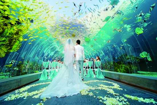 這裏是國內首家酒店式海洋餐廳:270°全海水縈繞,水波盪漾、粼粼之境,猶如藍色的夢境;燭光與音樂同在,魚、水、天三重空間的完美融合,將此刻凝滯在時光中。或者在8000平米的草地,與親朋好友開一個專屬的Party,讓翠草作你最自然的地毯,讓海浪聲做你婚禮上最原生的配樂,讓藍天鑒證這永恆的愛,讓您的婚禮成為刻骨銘心的回憶。還有1000平米穹頂無柱宴會廳,靈活布局為你打造稱心如意的婚禮場地!