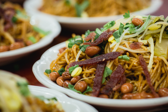 將大米浸泡后磨成米漿,用漏斗漏進沸騰的開水里,霎時變成一條條柔軟雪白的米絲,將米絲撈起放入冷水,再撈起一層一層疊放在竹籃里。吃時配上牛肉絲、乾蝦米、炒花生米、炸蒜頭油等配料。