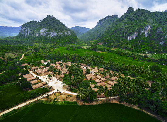 遠遠望去,一排黎苗風味濃郁的新房佇立在青山間,雲霧縈繞,走近細看,小橋、流水、竹筏,恍若仙境。在這裏可看黎苗歌舞,品嘗鄉村美食,重拾兒時的樂趣。
