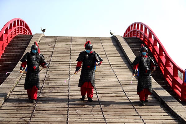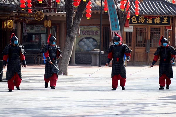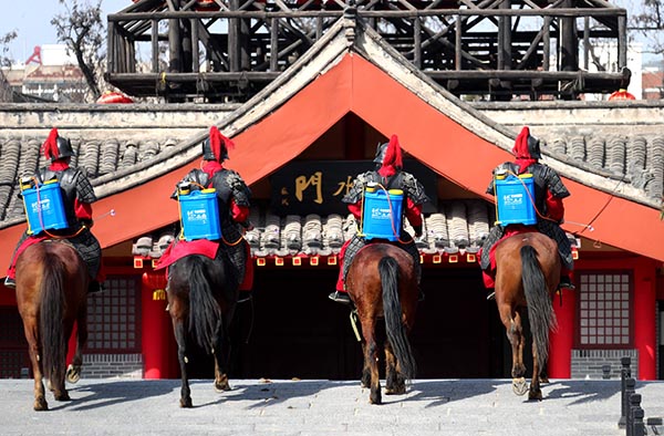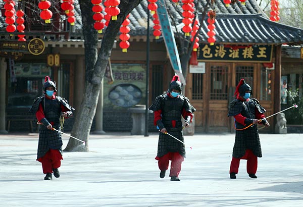 3月10日,河南開封清明上河園騎士們帶着口罩背着噴霧器在執行消殺工作。