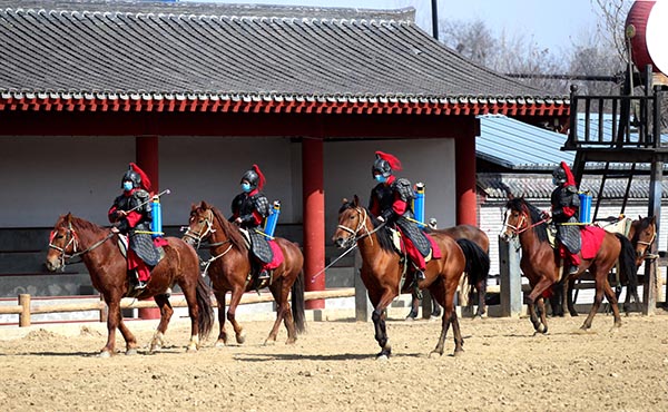 這些在平時演出馬戰的「宋兵宋將」們策馬充實進了防疫消殺隊伍,在偌大的園區執行起消殺任務,大家一起全力以赴迎接將於近日的恢復開園。他們在演出時扮演着馬背上廝殺的勇士,在疫情到來之時,結合自己的特長,變身防疫戰線上的輕騎兵。