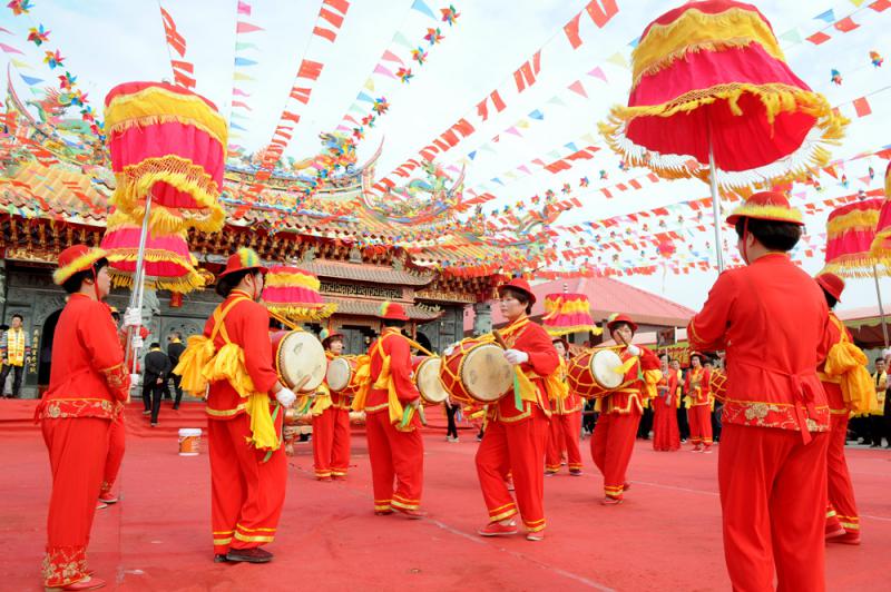 南靖縣有海外華僑華人3萬多人,祖籍南靖台胞100多萬人。圖為開幕式上,大鼓涼傘隊和腰鼓隊表演《歡樂頌》,祈福海峽兩岸風調雨順。 (中新社)