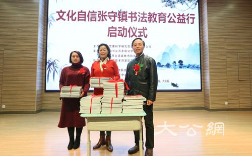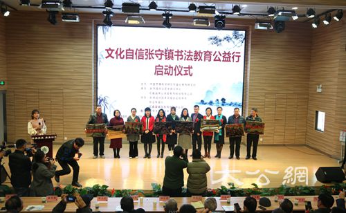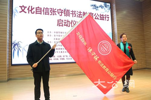 活動現場,張守鎮書法藝術研究中心主任劉凱靖為鄭州經濟技術開發區實驗中學授旗,並宣布「文化自信,張守鎮書法教育公益行」活動啟動。